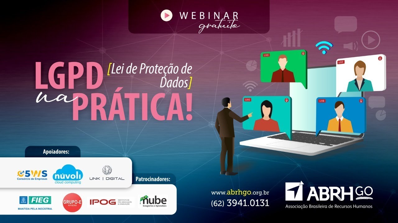 Webinar LGPD [Lei de Proteção dos Dados] na Prática Realização: ABRH GO – Associação Brasileira de Recursos Humanos Apoiadores: Consórcio 5WS – Núvoli Cloud Computing – UNK Digital Patrocinadores: FIEG – Grupo E Refeições – IPOG Instituto Pós-Graduação e Graduação – Nube Estagiários e Aprendizes Confira o evento gravado.